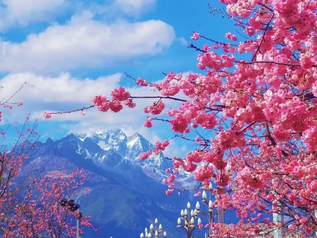 这时候的丽江,空气里都带着甜味,尤其是束河古镇上的那条雪山大道,两旁的樱花正开得肆意烂漫。