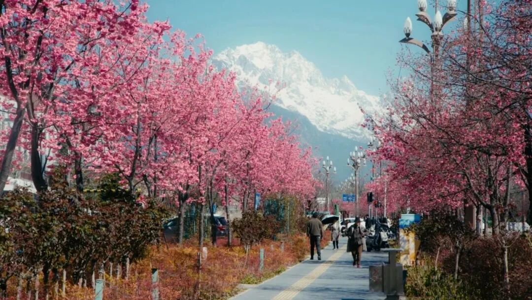 粉白的花瓣随风飘落,像是给远处的玉龙雪山铺了一层温柔的滤镜,走在树下,连呼吸都变得轻盈起来。