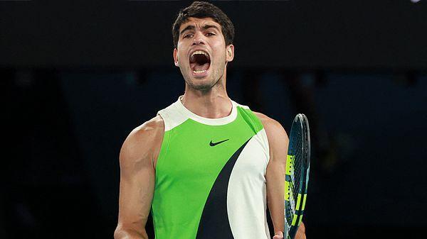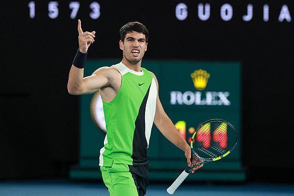 今年澳网阿尔卡拉斯一路过关斩将,先后以3比0战胜沃尔顿、汉夫曼、谢尔顿、保罗、德米纳尔,一盘未失强势挺进半决赛;半决赛中,他与上届赛会亚军兹维列夫激战五盘,耗时5小时27分钟,拿下澳网史上耗时最长的一场半决赛,惊险逆转取胜。