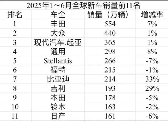 今年上半年,全球前十大车企中,比亚迪、吉利集团两家中国车企的销量双双超越本田、日产,同比增速分别为33%、29%,成为增速第一、第二名,也是榜单中唯二增速超过10%的车企。