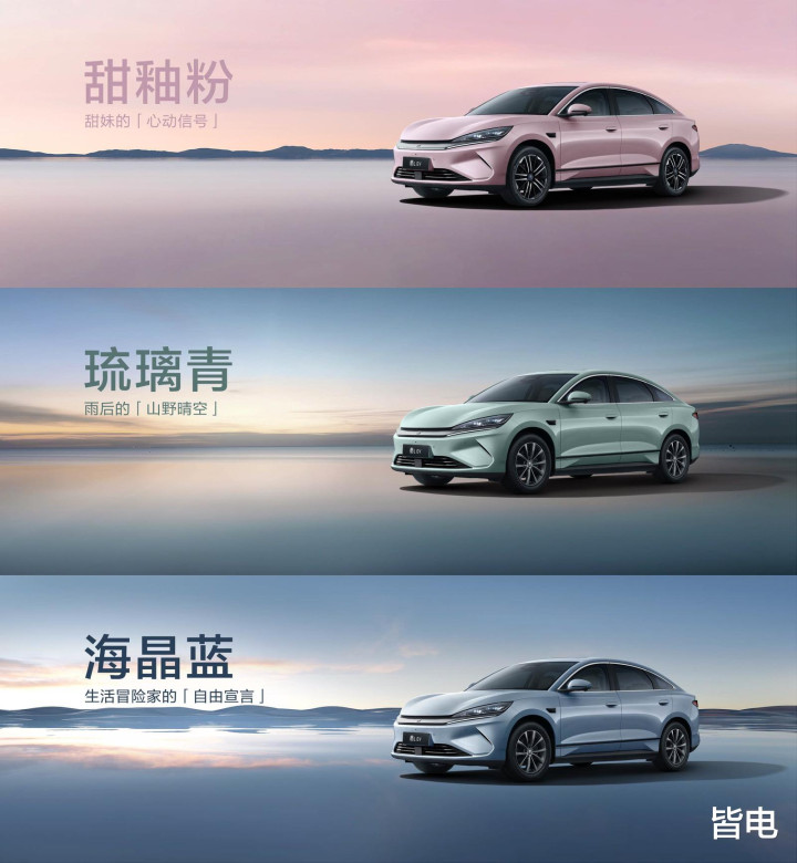 同时,为满足更多用户不同的个性化审美需求,秦L EV全系新增三款富有生命力的全新配色——甜釉粉、琉璃青、海晶蓝。