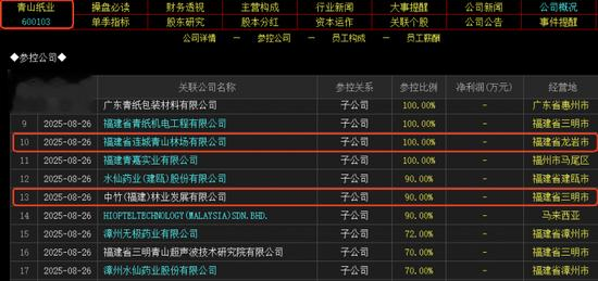 根据青山纸业(600103)在2025年半年报公布的最新资料显示,公司旗下有4家子公司是林场企业。其中,全资子公司福建省连城青山林场有限公司位于福建龙岩,另外三家股子公司——福建省明溪青珩林场有限公司、福建省泰宁青杉林场有限公司、中竹(福建)林业发展有限公司均位于福建三明。值得一提的是,青山纸业(600103)下属的林地分布在福建省三明地区和龙岩地区,而这两地正好是蕴藏大量林地稀土矿资源的区域。