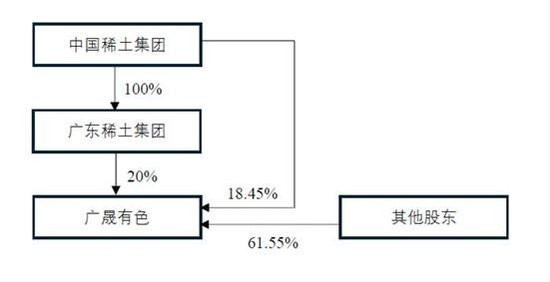 股权结构显示,广东稀土集团系中国稀土集团全资子公司,本次权益变动前,中国稀土集团通过广东稀土集团,间接持有广晟有色(600259)1.29亿股普通股,占上市公司总股本的38.45%。